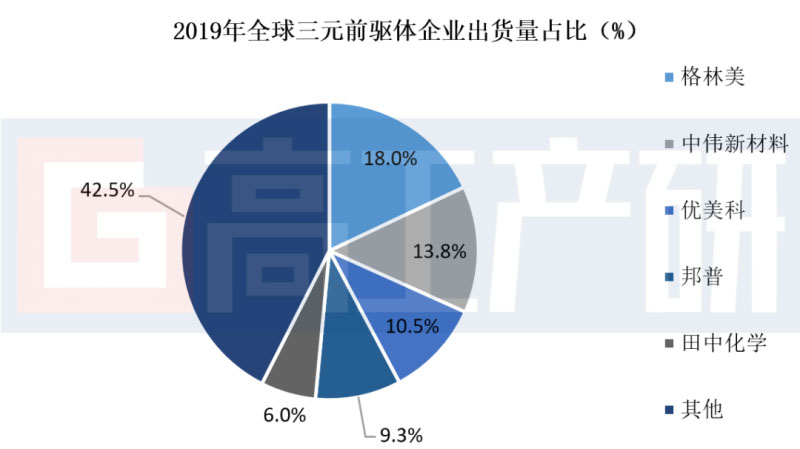 2019年全球三元前驅體市場出貨量33.4萬噸,同比增長45.2%。三元前驅體市場的速增長主要受全球三元正極材料市場帶動。從市場競爭格局角度分析,2019年全球三元前驅體市場CR3市場份額占比42.2%,CR5市場占比接近57.5%;從企業(yè)端出貨量市場占比來看,2019年全球三元前驅體市場出貨量前三的的企業(yè)為格林美、中偉新能源以及廣東邦普,其中格林美、中偉新能源三元前驅體產(chǎn)品除了國內企業(yè)自用外,還具有較大規(guī)模的出口量,出口給Ecopro、LGC、L&F等。