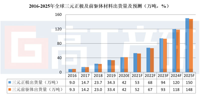 高工產(chǎn)研鋰電研究所(GGII)調研數(shù)據(jù)顯示,2019年全球三元正極材料出貨34.3萬噸,同比增長44.7%,帶動全球三元前驅體材料出貨量33.4萬噸。GGII預計2025年全球三元正極材料及前驅體出貨量將超過150萬噸。