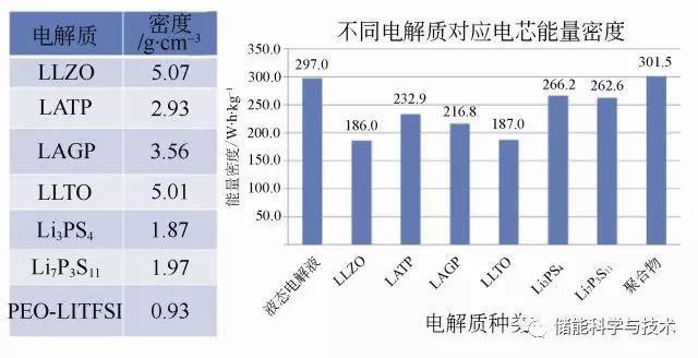 圖表中的縮寫意義:LLZO—鋰鑭鋯氧;LATP—磷酸鈦鋁鋰;LAGP—磷酸鍺鋁鋰;LLTO—鋰鑭鈦氧。鋰離子電池的液態(tài)電解質(zhì)密度為1.1 g/cm3。