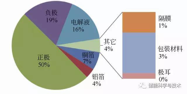 圖3展示了能量密度達到297 W·h/kg的鋰離子電池軟包電芯的各物質(zhì)占比,液態(tài)電解質(zhì)總共占比16%(質(zhì)量分數(shù))。