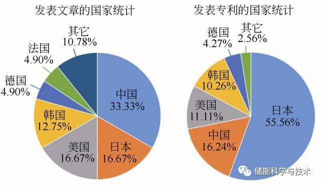 圖2 2017年不同國家發(fā)表的固體鋰電池文章及專利的數(shù)據(jù)統(tǒng)計