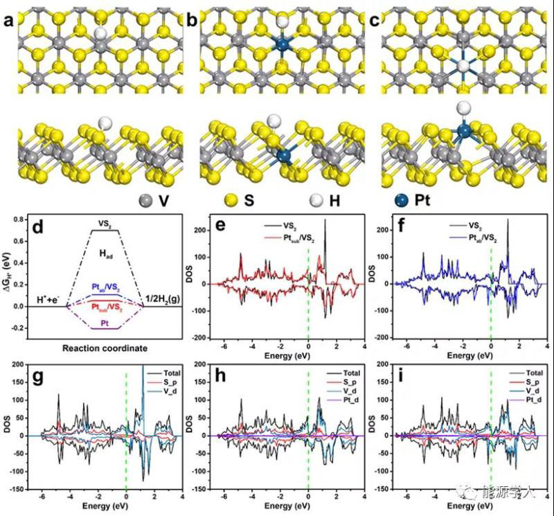 最后,對(duì)樣品的催化活性提升進(jìn)行了相關(guān)機(jī)理分析。圖5(a-c)分別為單純VS2,Pt摻雜VS2和Pt吸附VS2的氫原子化學(xué)吸附模型。通過(guò)計(jì)算可以得到其相應(yīng)的氫吸附自由能如圖5(d)所示,可以發(fā)現(xiàn)Pt的引入,無(wú)論是以取代V原子形式存在或是以吸附在VS2表面的形式存在,氫吸附自由能都比單純的VS2和單純的Pt更加接近于熱中性值,更加有利于氫吸附和解吸過(guò)程,從而增強(qiáng)電催化析氫性能。同時(shí)通過(guò)對(duì)比DOS也可以發(fā)現(xiàn)(圖5(e-i)),Pt摻雜或吸附后,費(fèi)米面附近的態(tài)密度有所增強(qiáng),意味著能夠有更多的電荷參與到反應(yīng)中,也對(duì)于提升電催化析氫活性有所幫助。