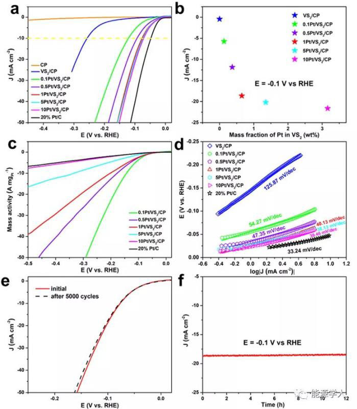 圖4. 0.5M H2SO4為電解液下的HER性能:不同形態(tài)鉑修飾的VS2的(a)LSV曲線;(b)電流隨鉑含量的變化;(c)單位鉑質(zhì)量活性;(d)Tafel斜率。(e)和(f)單原子鉑修飾的VS2催化劑的穩(wěn)定性測(cè)試結(jié)果。