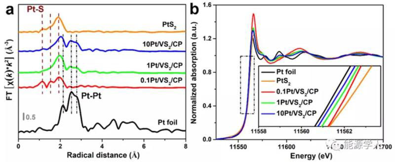 圖3. 不同形態(tài)鉑修飾的VS2的XAFS表征結(jié)果:(a)EXAFS和(b)XANES。