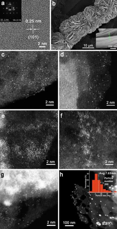 圖2. (a)VS2的HRTEM圖像,插圖為SAED圖像。(b)VS2/CP的SEM圖像。(c-h)不同形態(tài)鉑修飾的VS2的HAADF-STEM圖像。