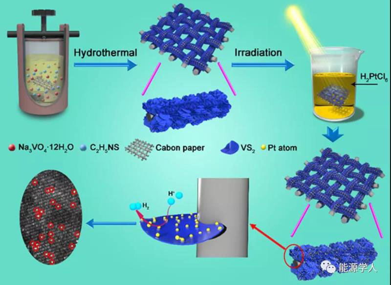 利用VS2為基礎(chǔ)的電催化劑來(lái)提高HER的整體性能已有大量研究,但據(jù)我們所知,目前還沒(méi)有系統(tǒng)的研究將不同的Pt形態(tài)尤其是單原子Pt加入到VS2中來(lái)考察它們對(duì)HER的影響。因此,研究人員以VS2為基礎(chǔ)材料,對(duì)其進(jìn)行了鉑單原子修飾,從而得到了催化性能十分優(yōu)異且成本低廉的復(fù)合電催化劑材料。首先,通過(guò)一步水熱法在碳紙上原位生長(zhǎng)了VS2納米片。然后,將長(zhǎng)有VS2納米片的碳紙與不同濃度的氯鉑酸溶液充分混合均勻,碳紙兩面分別在氙燈光源下照射一段時(shí)間即可得到不同鉑形態(tài)修飾的VS2納米片。通過(guò)控制氯鉑酸濃度和照射時(shí)間即可得到單原子鉑修飾的二硫化釩催化劑。