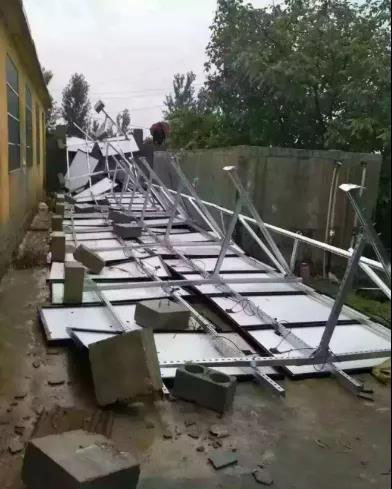 以抗傾覆設(shè)計(jì)舉例,屋面光伏項(xiàng)目需要設(shè)計(jì)的抗傾覆系數(shù)是1.6,也就是說要設(shè)計(jì)的抗傾覆彎矩是傾覆彎矩的1.6倍,才能滿足安全要求。因此,圖3電站中的抗傾覆彎矩大概需要設(shè)計(jì)到952千牛米,才是安全的。而屋面電站的結(jié)構(gòu)事故許多也是因?yàn)榭箖A覆設(shè)計(jì)不足造成的,如下圖:
