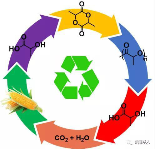 為保護生態(tài),目前工業(yè)上對于化工產品的綠色循環(huán)利用十分重視。脂肪族聚碳酸酯與聚酯作為常見的可生物降解材料,將其應用到固態(tài)鋰電池中,對于鋰電池的綠色循環(huán)意義顯著。如聚乳酸(PLA)是一種最常見的可生物降解的高分子材料,其通常由丙交酯開環(huán)聚合而成,而丙交酯可通過玉米、小麥等通過發(fā)酵生成的乳酸通過環(huán)化反應制備,PLA也可在酶的催化作用下最終降解為CO2和水,回到自然界。其綠色循環(huán)途徑如圖6所示。