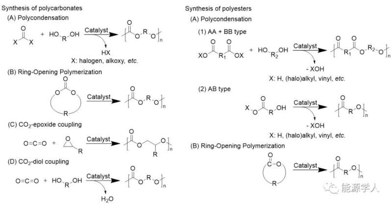 脂肪族聚碳酸酯的合成主要有四種策略:縮聚、開環(huán)聚合、CO2-環(huán)氧偶聯(lián)聚合與CO2-二醇偶聯(lián)聚合(如圖5所示)。其中最吸引人注意的是采用CO2作為原料進行的偶聯(lián)聚合,該聚合是一種環(huán)境友好型聚合反應,其原料為溫室氣體CO2,對于環(huán)境保護具有非常重要的意義,但該類反應仍需進一步優(yōu)化,研究開發(fā)高效的催化劑以提高反應效率并降低副反應。而脂肪族聚酯的合成通常有兩種辦法:縮聚和開環(huán)聚合。其中縮聚主要包括AA+BB型的雙單體聚合體系與AB型單一單體聚合體系。由于聚碳酸酯與聚酯的化學結構在一定程度上相似,因此它們的很多催化劑可以通用。特別地,對于脂肪族聚碳酸酯和聚酯,某些特定種類的酶對于其合成和降解具有顯著的催化效果,因而可能實現固態(tài)電池中SPE材料的綠色合成和電池材料的綠色循環(huán)利用。