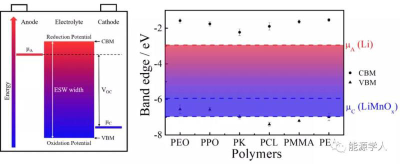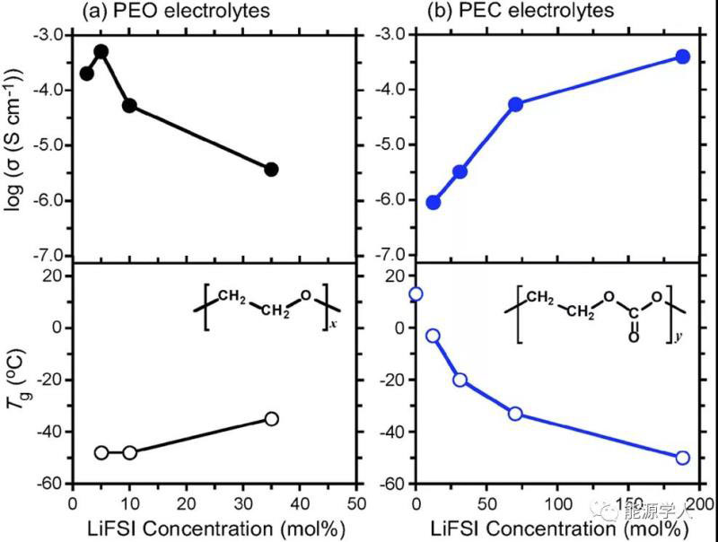 羰基配位SPE在離子電導率、鋰離子遷移數和電化學穩(wěn)定窗口方面較聚醚類SPE具有顯著的優(yōu)勢。這是因為聚醚類SPE的醚氧與鋰離子配位形成Li-O鍵較穩(wěn)定,難以斷開而導致離子電導率較低、鋰離子遷移數??;聚醚類聚合物(如PEO)的較高結晶性也限制了其室溫離子電導率;此外,聚醚的HOMO能級較高,因而氧化電位低,電化學穩(wěn)定性較差。而羰基配位SPE(主要為脂肪族聚酯和聚碳酸酯類)的羰基氧和鋰離子配位后,較容易斷裂解離,因而該類SPE具備較高的離子電導率和鋰離子遷移數;該類SPE在高鋰鹽濃度條件下,多余的鋰鹽由于增塑作用可顯著降低聚合物的玻璃化溫度,因而提高其室溫離子電導率至10-4 S cm-1(如圖2中的基于聚碳酸乙烯酯PEC的SPE);聚酯和聚碳酸酯的HOMO能級較聚醚顯著降低,因而抗氧化性明顯提高。相關的聚醚類SPE(以PEO為例)與羰基配位SPE(PEC為例)在離子電導率、鋰離子遷移數和電化學穩(wěn)定性的對比如下圖2、3和4所示。