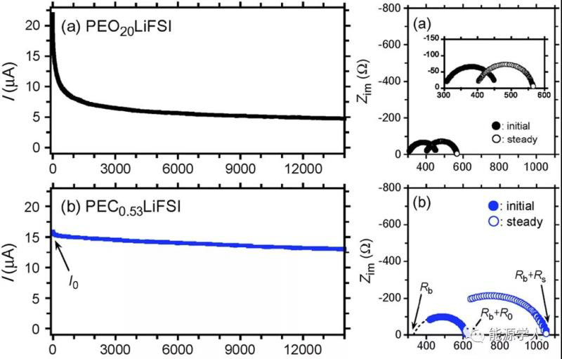 圖3 PEO基SPE與PEC基SPE的鋰離子遷移數對比圖。