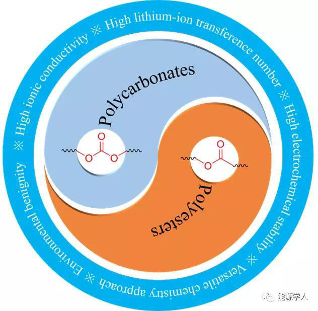 二次鋰離子電池具有諸多優(yōu)點,如無記憶效應、高工作電壓、寬耐溫范圍、低自放電率和長循環(huán)壽命等,在新能源汽車領域的應用中大放異彩。隨著新能源汽車對行駛距離和安全性的要求越來越高,采用固態(tài)電解質替代液態(tài)電解液的新型固態(tài)鋰電池也成為目前電池領域的研究焦點。固態(tài)鋰電池不僅有望從根本上解決鋰電池的安全性隱患,也可大大提升其在能量密度和電池柔性化方面的優(yōu)勢。作為固態(tài)電解質中最有前景的一種,聚合物固態(tài)電解質(SPE)具有一定的柔性和彈性,且質輕、成膜性好、與電極材料之間化學穩(wěn)定性好、界面接觸阻抗小,基于SPE的全固態(tài)鋰電池具有安全、柔性佳和加工性能好等優(yōu)點,且在電池能量密度、工作溫度區(qū)間、循環(huán)壽命等方面均有較大的提升。然而,目前研究得最多的SPE是基于醚類聚合物,如聚環(huán)氧乙烷(PEO),其室溫離子電導率低(<10?6 S /cm)、鋰離子遷移數小(< 0.2)、電化學穩(wěn)定窗口窄(< 3.9 V),極大限制了SPE的大規(guī)模應用。羰基配位型SPE(主要為脂肪族聚碳酸酯類和聚酯類)由于其特殊的分子結構,賦予了該類SPE獨特的電化學性質。