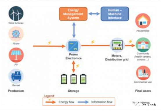最初,小型電網(wǎng)完全是以柴油發(fā)電或水力發(fā)電為基礎(chǔ)的。過去10年,光伏價格的下跌有利于開發(fā)基于光伏的小型電網(wǎng)。當(dāng)前的典型項目包括光伏組件、電池、備用柴油發(fā)電機(jī)、能源管理系統(tǒng)(EMS)。此外,當(dāng)然還包括逆變器、電表和當(dāng)?shù)仉娋W(wǎng),