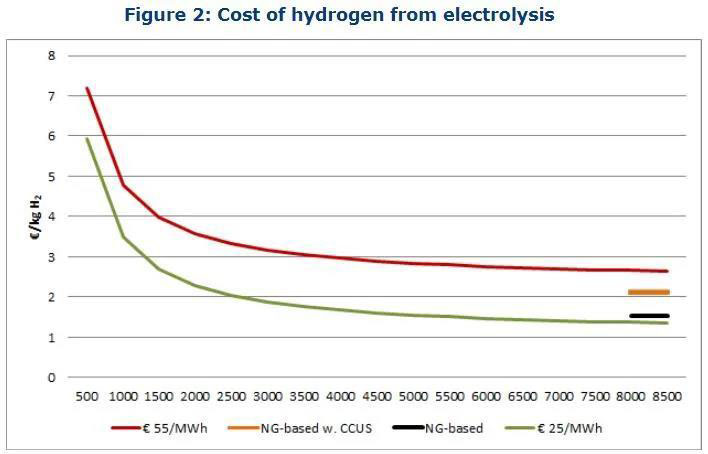 法國國際關(guān)系研究所表示,與普遍持有的看法相反,因為不需要貴重材料,超大規(guī)模的電解槽價格僅為400歐元/千瓦,并不十分昂貴。因此,如果其容量系數(shù)(或利用率)每年不低于3000個滿負荷小時(FLH),甚至可以大于5000FLH,則電解成本將由電力成本而不是電解槽成本決定。