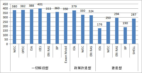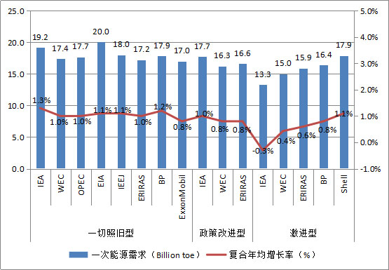 在政策改進(jìn)型預(yù)測中,WEC現(xiàn)代爵士樂情景和ERIRAS創(chuàng)新情景認(rèn)為全球一次能源需求在160億噸~170億噸油當(dāng)量之間,年均增長0.8%,IEA既定政策情景則認(rèn)為一次能源需求將超過170億噸油當(dāng)量,年均增長1.0%,幾乎與其他機(jī)構(gòu)的一切照舊型預(yù)測相當(dāng),從這一角度講,有專家認(rèn)為,IEA的預(yù)測過于保守。