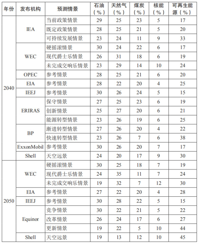 表2 各機(jī)構(gòu)全球一次能源結(jié)構(gòu)預(yù)測