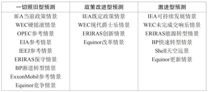 上述各機(jī)構(gòu)展望中設(shè)置的情景可以歸為三類:一是中規(guī)中矩、保持現(xiàn)行趨勢的一切照舊型預(yù)測,包括IEA當(dāng)前政策情景、WEC硬搖滾情景、OPEC參考情景、EIA參考情景、IEEJ參考情景、ERIRAS保守情景、BP漸進(jìn)轉(zhuǎn)型情景、ExxonMobil參考情景、Equinor競爭情景等;二是技術(shù)進(jìn)步和政策調(diào)整情況下的政策改進(jìn)型預(yù)測,包括IEA既定政策情景、WEC現(xiàn)代爵士樂情景、ERIRAS創(chuàng)新情景、Equinor改革情景等;三是為應(yīng)對氣候變化而制定嚴(yán)格氣候政策,進(jìn)而導(dǎo)致能源行業(yè)迅速轉(zhuǎn)型的激進(jìn)型預(yù)測,包括IEA可持續(xù)發(fā)展情景、WEC未完成交響樂情景、ERIRAS能源轉(zhuǎn)型情景、BP快速轉(zhuǎn)型情景、Shell天空遠(yuǎn)景、Equinor更新情景等(見表1)。