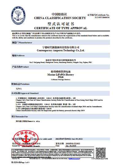 寧德時(shí)代海洋船舶動(dòng)力電池系統(tǒng)擁有官方首套“身份證”。2020年4月,寧德時(shí)代成為國(guó)內(nèi)首家通過(guò)中國(guó)船級(jí)社(CCS)最新檢測(cè)指南《純電池動(dòng)力船舶檢驗(yàn)指南》認(rèn)可和檢驗(yàn)(包括電芯、電池包、電池管理系統(tǒng))的動(dòng)力電池企業(yè)。