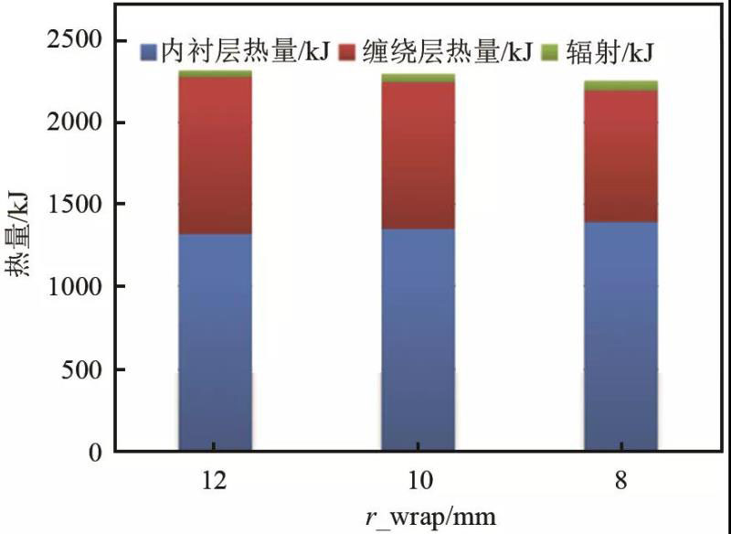 儲(chǔ)氫瓶的纏繞層一般由碳纖維和環(huán)氧樹脂復(fù)合材料構(gòu)成,對(duì)于不同制造商生產(chǎn)的III型瓶,其纏繞層的厚度可能不同,有必要研究其對(duì)加氫溫升的影響。圖5是不同纏繞層厚度下,加氫過程中儲(chǔ)氫瓶?jī)?nèi)氫氣的散熱量對(duì)比,加氫條件與2.1節(jié)所描述一致。結(jié)果表明,當(dāng)纏繞層厚度由12 mm減薄至8 mm時(shí),加氫過程中瓶?jī)?nèi)氫氣總散熱量由2317 kJ降低為2255 kJ,加氫結(jié)束后瓶?jī)?nèi)氫氣溫度由73.5 ℃上升至75.2 ℃。當(dāng)儲(chǔ)氫瓶的纏繞層厚度減小時(shí),加氫過程中氫氣的散熱量有所降低,但降低幅度不如內(nèi)襯層厚度減薄時(shí)明顯。這是由于纏繞層材料導(dǎo)熱系數(shù)顯著低于內(nèi)襯層,其貢獻(xiàn)的氫氣散熱量低于內(nèi)襯層;另一方面,當(dāng)纏繞層厚度減薄后,纏繞層材料質(zhì)量減少、吸收總熱量減少,因此貢獻(xiàn)的氫氣散熱量降低。此外,儲(chǔ)氫瓶壁面至環(huán)境的自然對(duì)流散熱量十分有限,纏繞層厚度減薄導(dǎo)致的外壁面對(duì)流散熱量增加可忽略不計(jì)。