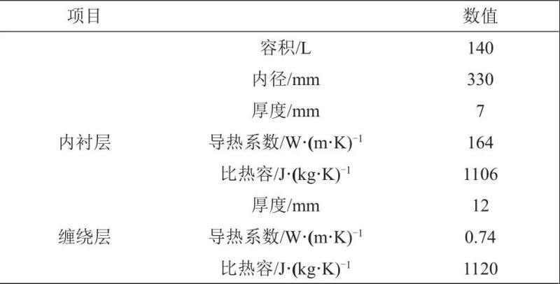 國(guó)內(nèi)典型III型儲(chǔ)氫瓶的結(jié)構(gòu)參數(shù)如表1所示,仿真結(jié)果表明,加氫結(jié)束后儲(chǔ)氫瓶?jī)?nèi)氫氣溫度為73.5 ℃,溫升48.5 ℃。氫氣加注過程中儲(chǔ)氫瓶?jī)?nèi)氫氣溫度逐漸升高,向儲(chǔ)氫瓶壁面散熱,首先與內(nèi)壁發(fā)生傳熱使得鋁內(nèi)膽內(nèi)襯溫度升高,然后內(nèi)襯層將熱量傳導(dǎo)至纏繞層,最后經(jīng)外壁面散熱至環(huán)境。在氫氣加注的280 s時(shí)間內(nèi),儲(chǔ)氫瓶?jī)?nèi)氫氣對(duì)壁面的總散熱量為2317 kJ,其中鋁內(nèi)膽內(nèi)襯吸收熱量1319 kJ,碳纖維纏繞層吸收熱量956 kJ,經(jīng)儲(chǔ)氫瓶壁面向環(huán)境散熱量42 kJ,這說明加氫過程中瓶?jī)?nèi)氫氣的換熱量有98%被儲(chǔ)氫瓶體吸收,僅有2%熱量散出儲(chǔ)氫瓶,因此,儲(chǔ)氫瓶壁面的導(dǎo)熱特性對(duì)加氫溫升有直接影響。