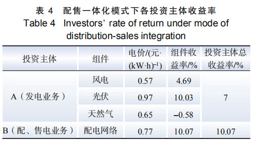運營模式 3:配售一體化模式。園區(qū)微網由 A 和 B 投資。A 投資風電、光伏、天然氣,從事發(fā)電業(yè)務,采用全部上網模式;B 投資園區(qū)配網, 從事配網、售電業(yè)務。投資收益結果如表 4 所示。