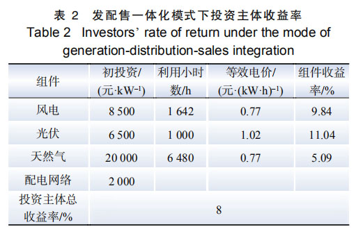 運營模式 1:發(fā)配售一體化模式,園區(qū)微網全部由 A 投資,包括風電、光伏、天然氣、園區(qū) 配電網絡。表 2 是投資主體 A 投資收益計算結 果,配電網單元投資收益體現在風電、光伏、天然氣電價不需要扣除輸配價。