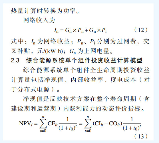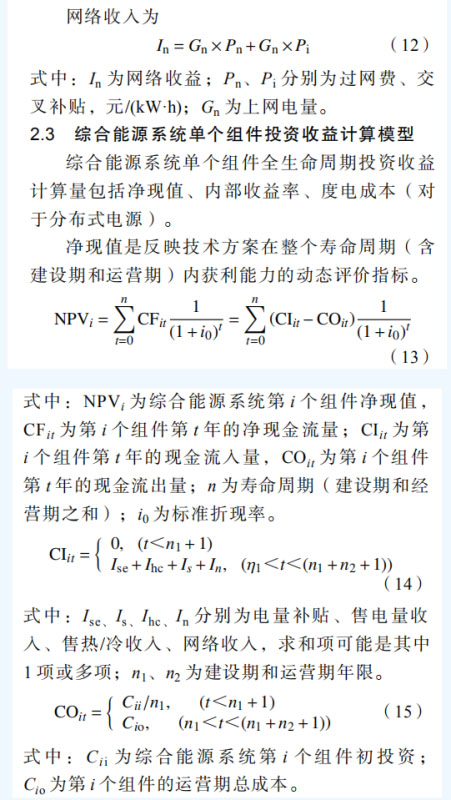 綜合能源系統(tǒng)是在規(guī)劃、建設和運行等過程中,對各種能源的產生、傳輸與分配(供能網 絡)、轉換、存儲、消費、交易等環(huán)節(jié)實施有機 協(xié)調與優(yōu)化,進而形成的能源產供消一體化系 統(tǒng)[1-2]。目前中國正處于能源轉型關鍵時期,能源成本高等問題突出。綜合能源系統(tǒng)可有效提高能 效、降低投資運營成本,帶動和提升能源相關產業(yè)的國際競爭力,對推進能源供給側改革、推動中國能源轉型具有重要意義,是“建設清潔低碳、安全高效的現代能源體系”的重要組成部分[3]。 世界各國均制定了綜合能源系統(tǒng)建設發(fā)展戰(zhàn) 略,美國能源部 DOE2001 年提出綜合能源系統(tǒng)發(fā) 展計劃,并于 2007 年 12 月頒布能源獨立和安全 法(EISA),要求在社會主要供用能環(huán)節(jié)必須規(guī) 劃綜合能源,美國一些大型電力公司同時也是典 型的綜合能源供應商,如太平洋煤氣電力公司、 愛迪生電力公司等 [ 4 ]。加拿大內閣能源委員會 2009 年 9 月頒布了相關指導意見[5],明確提出在 全國范圍構建社區(qū)綜合能源系統(tǒng)( integrated communityenergysolutions,ICES)。歐盟第 5 代框 架中提出多能源協(xié)同優(yōu)化,對用戶側綜合能源系統(tǒng)、多能源協(xié)同優(yōu)化互補、可再生能源開發(fā)與交通運輸清潔化等展開研究[6],之后的第 6 代、第 7 代框架中繼續(xù)對多能源系統(tǒng)優(yōu)化展開了深入研 究[7-8],于 2014 年提出地平線 2020 計劃,在智 能、綠色和綜合交通領域投入 63.39 億歐元,在安全、清潔和高效能源領域投入 59.31 億歐元。 日本重點開展智能社區(qū)技術的研究與示范,基于 社區(qū)綜合能源系統(tǒng)(包括:電力、燃氣、熱力、 可再生能源等),集成交通、供水、信息和醫(yī)療系統(tǒng)[9]。中國 2016 年召開雙清論壇“新一代電力綜 合能源系統(tǒng)”,在多個 973、863 項目啟動了綜合 能源系統(tǒng)研究,且與新加坡、德國、英國等國家 在綜合能源系統(tǒng)基礎理論、關鍵技術、核心設備 和工程示范等多個方面開展國際合作?;诰C合 能源系統(tǒng)的綜合能源服務已成為眾多發(fā)電企業(yè)、 新能源企業(yè)、電網企業(yè)重要轉型方向[10-11]。 隨著電力市場化改革推進,園區(qū)成為電力改 革重要實驗區(qū),園區(qū)綜合能源系統(tǒng)建設運營成為 綜合能源服務商主攻業(yè)務[1 2-1 3]。在增量配電放 開、多元源荷廣泛接入下,園區(qū)綜合能源系統(tǒng)投 資界面出現了分化,投資主體也呈現多元化特點,投資效益分析變得錯綜復雜。目前綜合能源系統(tǒng)經濟性研究方面已有一些針對單個組成單 元,比如分布式光伏開展了量化測算[14-16],對分布式天然氣、配網等開展了經濟指標評價法,但量化投資效益測算尚未開展[17-19],此外,分界面 屬于電改形勢下產生的新問題,面向多主體的綜合能源系統(tǒng)分界面投資效益量化分析目前尚未有相關研究成果可供參考和借鑒。