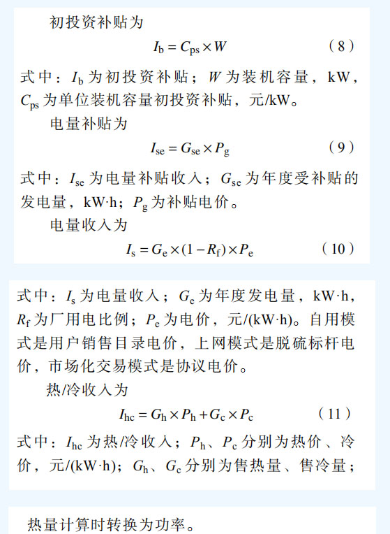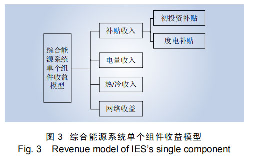 單個組件收益模型綜合能源系統(tǒng)單個組件收益包括初投資補貼、熱/冷收入(天然氣)、電量收入、度電補貼等,單個組件收益模型如圖 3 所示。