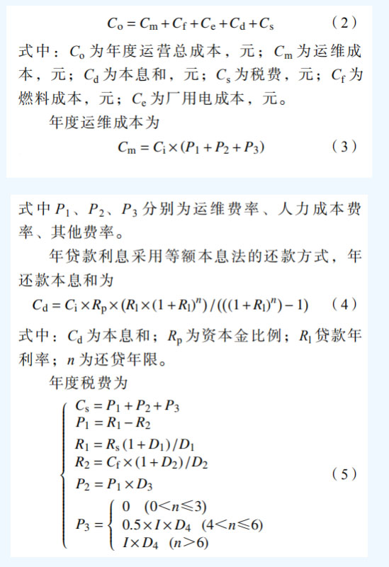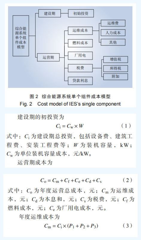 2.1 綜合能源系統(tǒng)單個組件成本模型 綜合能源系統(tǒng)單個組件成本包括建設期的初始投資,運營期的運維成本(運維費、人力成本 等)、燃料成本(對于分布式天然氣、生物質有 此成本,光伏、風電沒有)、廠用電損耗、貸款 利息、稅費等,單個組件成本模型如圖 2 所示。