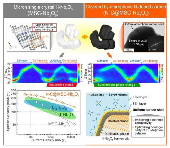 引入無定型碳層對H型Nb2O5晶體表界面電子和離子輸運均勻性及結構變化可逆性的改善策略示意圖