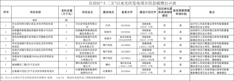 文件表示,根據(jù)《“十二五”以來新疆維吾爾族自治區(qū)風(fēng)電和光伏發(fā)電項(xiàng)目有關(guān)情況公示》要求,按照競爭性配置重新確定項(xiàng)目業(yè)主的項(xiàng)目,各地市要重新通過競爭性配置方案確定業(yè)主,需要重新配置業(yè)主的光伏電站規(guī)模為20萬千瓦,項(xiàng)目名單如下。
