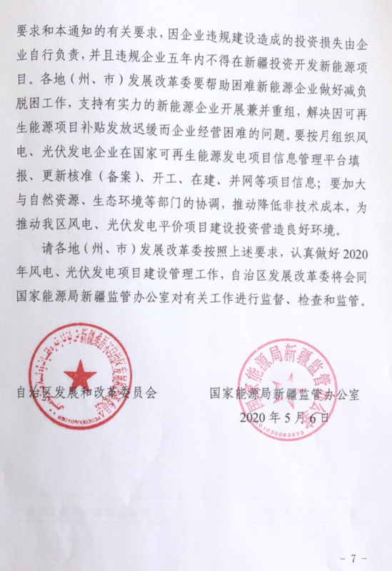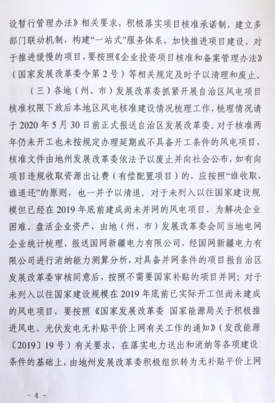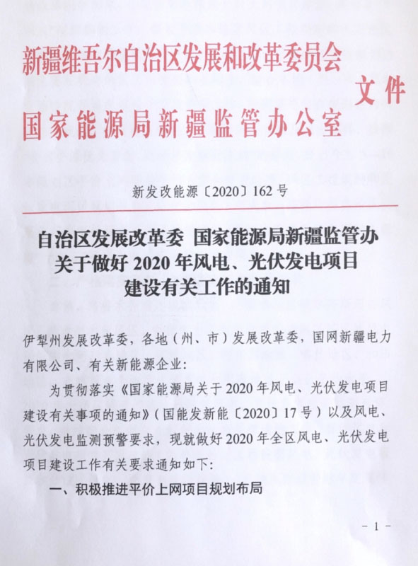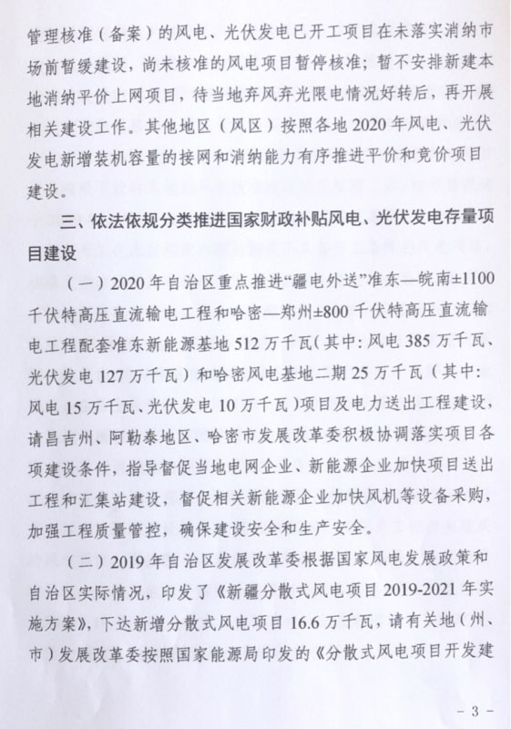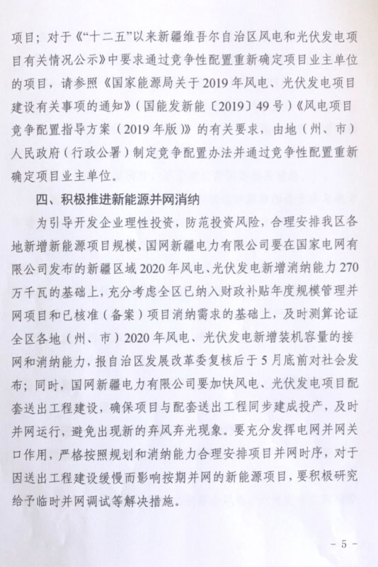 2020年5月6日,新疆發(fā)改委下發(fā)《關(guān)于做好2020年風(fēng)電、光伏發(fā)電項(xiàng)目建設(shè)有關(guān)工作的通知》。文件中指出,根據(jù)國家電網(wǎng)發(fā)布的消納數(shù)據(jù),新疆區(qū)域2020年風(fēng)電、光伏新增消納能力為270萬千瓦,為引導(dǎo)開發(fā)企業(yè)理性投資,國網(wǎng)新疆電力公司要在此基礎(chǔ)上,充分考慮全區(qū)的存量補(bǔ)貼項(xiàng)目和核準(zhǔn)項(xiàng)目的消納需求,及時測算論證各州、市新增裝機(jī)的接網(wǎng)和消納能力,于5月底前向社會公布。