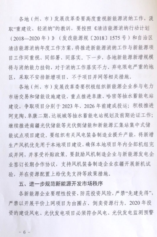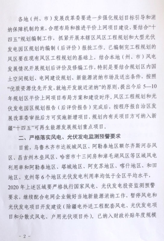 文件明確,由于光伏發(fā)電利用率低于全區(qū)平均水平,阿勒泰、塔城、阿克蘇、喀什、和田、克州等6個地區(qū)2020年暫不安排新增光伏項(xiàng)目(疆電外送配套項(xiàng)目及戶用光伏除外),存量有補(bǔ)貼已開工項(xiàng)目在未落實(shí)消納市場前暫緩建設(shè)。