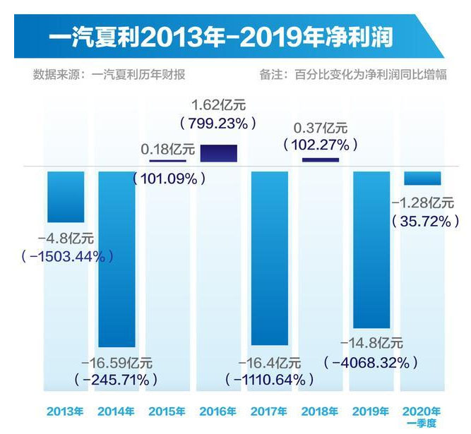 實(shí)際上,一汽夏利的危機(jī)由來(lái)已久。4月8日,一汽夏利發(fā)布2019年年報(bào),全年?duì)I業(yè)收入4.29億元,與2018年同期相比減少61.85%;歸屬于母公司股東的凈利潤(rùn)虧損14.81億元,同比下滑4068.32%。次日,一汽夏利股票停牌一天。4月10日復(fù)牌后,一汽夏利“披星戴帽”變更為“*ST夏利”。