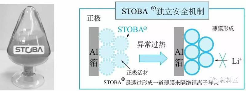 上圖采用一種納米級(jí)樹枝狀結(jié)構(gòu)的高分子化合物(STOBA)對(duì)NCM(424)進(jìn)行涂層,當(dāng)鋰電池發(fā)生異常,產(chǎn)生高溫時(shí),會(huì)形成一道薄膜阻隔鋰離子間的流動(dòng),穩(wěn)定鋰電池,借以提高電池安全度。由下圖可見(jiàn),針刺實(shí)驗(yàn)時(shí),正極材料未涂STOBA涂層的電池內(nèi)部溫度在幾秒鐘內(nèi)升至700℃,而用STOBA涂層正極材料的電池溫度最高只有150℃。