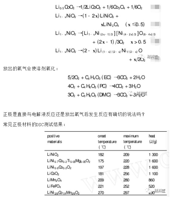 常見(jiàn)的正極材料在溫度低于650℃時(shí)是穩(wěn)定的,在充電時(shí)處于亞穩(wěn)定狀態(tài),溫度升高時(shí)發(fā)生如下反應(yīng)。