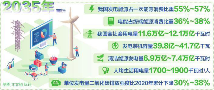 《報告》提出,將提高全社會電氣化水平納入國家能源戰(zhàn)略,凝聚各方關(guān)于電氣化發(fā)展的共識,明確電氣化發(fā)展作為推動能源消費(fèi)、供給、技術(shù)、體制革命與全方位加強(qiáng)能源國際合作的重要路徑。通過引導(dǎo)各類清潔發(fā)電能源合理布局、協(xié)調(diào)發(fā)展,提升電力系統(tǒng)安全運(yùn)行和智慧化水平,加大工業(yè)、建筑、交通領(lǐng)域電能替代和能效提升力度,深化電力體制改革,激發(fā)電氣化發(fā)展新動能,縮小不同行業(yè)和區(qū)域間的電氣化水平差距。預(yù)計到2035年,我國全社會用電量達(dá)到11.6萬億~12.1萬億千瓦時,發(fā)電裝機(jī)容量達(dá)到39.8億~41.7億千瓦,清潔能源發(fā)電裝機(jī)占比提高到71%~75%,清潔能源發(fā)電量達(dá)到6.9萬億~7.4萬億千瓦時,人均生活用電量達(dá)到1700~1900千瓦時/人,單位發(fā)電量二氧化碳排放強(qiáng)度比2020年累計下降30%~38%。全國電氣化發(fā)展更趨平衡、更加充分,全社會電氣化水平持續(xù)提高,電氣化進(jìn)程將更加有力地促進(jìn)能源電力發(fā)展綠色低碳轉(zhuǎn)型,為我國經(jīng)濟(jì)社會高質(zhì)量發(fā)展提供強(qiáng)勁支撐。