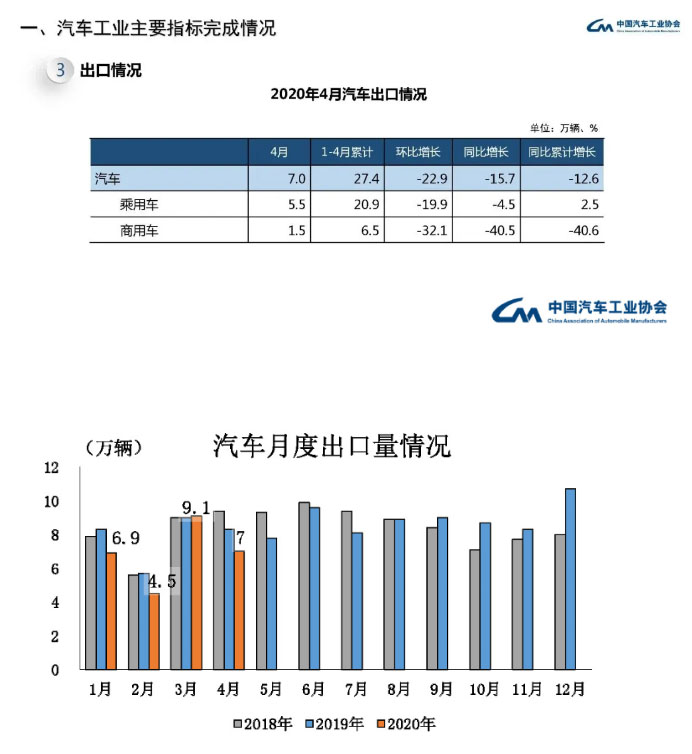因?yàn)楹M庖咔檩^國內(nèi)爆發(fā)較晚,4月汽車出口的影響并不太大,不過隨著海外疫情的擴(kuò)散,汽車出口受到的影響可能會在未來有所擴(kuò)大。4月,汽車企業(yè)出口7.0萬輛,環(huán)比下降22.9%,同比下降15.7%。分車型看,乘用車本月出口5.5萬輛,環(huán)比下降19.9%, 同比下降4.5%;商用車出口1.5萬輛,環(huán)比下降32.1%,同比下降40.5%。許海東判斷,今年全年汽車出口可能會出現(xiàn)20萬輛的下降。