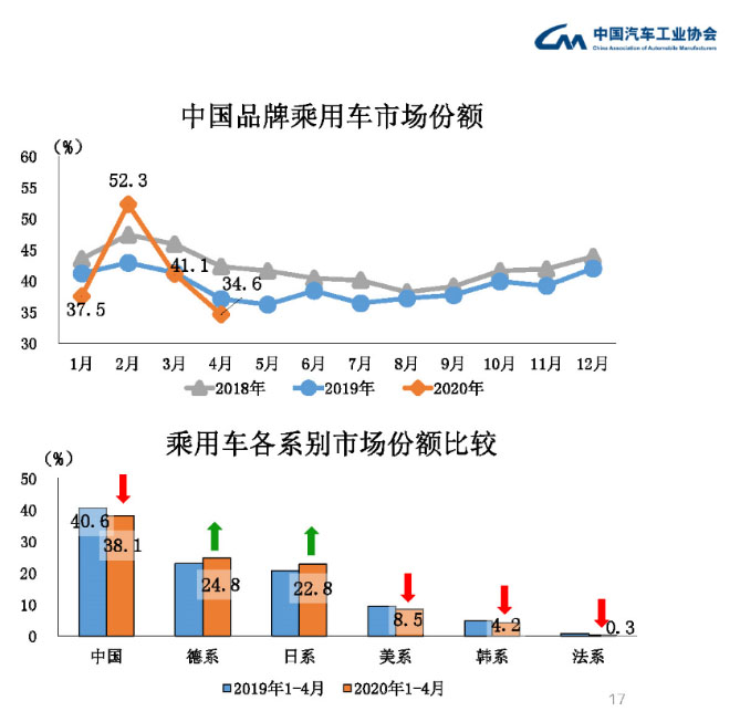4月,中國品牌乘用車銷量為53.2萬輛,同比下降9.4%;市場份額來到34.6%,同比下降2.6個百分點(diǎn)。德系、日系的市場占有率仍在進(jìn)一步上升,美系、韓系和法系都有所降低。陳世華表示,當(dāng)前的市場并非正常狀況下的消費(fèi)市場,中國品牌市場份額的下降并不能說明什么問題,對其市場發(fā)展的判斷還有待觀察。