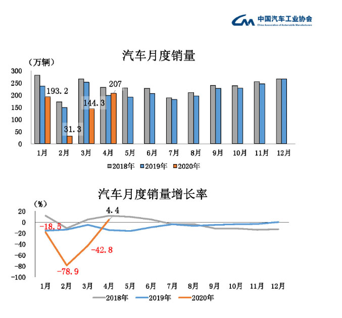 5月11日,中汽協(xié)發(fā)布的統(tǒng)計(jì)數(shù)據(jù)顯示,4月產(chǎn)銷量明顯好于此前的預(yù)期。4月汽車產(chǎn)銷均超過200萬輛,略高于上年同期水平。數(shù)據(jù)顯示,4月,汽車產(chǎn)銷分別完成210.2萬輛和207萬輛,環(huán)比增長46.6%和43.5%,同比分別增長2.3%和4.4%,月增速為今年以來的首次增長,其中,銷量更是結(jié)束了連續(xù)21個月的下降。1-4月,汽車產(chǎn)銷分別完成559.6萬輛和576.1萬輛,產(chǎn)銷量同比分別下降33.4%和31.1%。