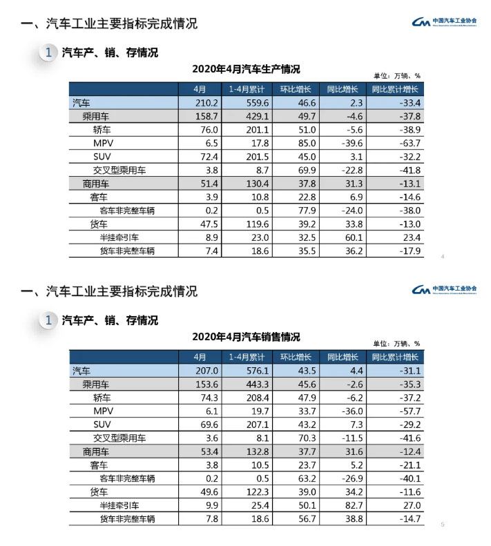 4月,乘用車產(chǎn)銷降幅大幅收窄,其中SUV產(chǎn)銷已實(shí)現(xiàn)正增長;商用車則呈現(xiàn)大幅增長,單月產(chǎn)銷量創(chuàng)歷史新高,其中重型貨車增長迅猛,達(dá)到月度產(chǎn)銷歷史最高水平,輕型、微型貨車增長也比較明顯。當(dāng)月,乘用車產(chǎn)銷分別完成158.7萬輛和153.6萬輛,環(huán)比分別增長49.7%和45.6%,同比分別下降4.6%和2.6%,降幅較3月收窄45.3和45.8個百分點(diǎn)。1-4月,乘用車產(chǎn)銷分別完成429.1萬輛和443.3萬輛,同比分別下降37.8%和35.3%。中汽協(xié)副秘書長陳士華表示,對比乘用車和商用車的產(chǎn)銷數(shù)據(jù)可以發(fā)現(xiàn),當(dāng)前私人消費(fèi)還沒有恢復(fù)到正常狀態(tài),以私人消費(fèi)為主的乘用車市場雖然回暖但增速并不明顯,而商用車尤其是貨車市場出現(xiàn)大幅增長。