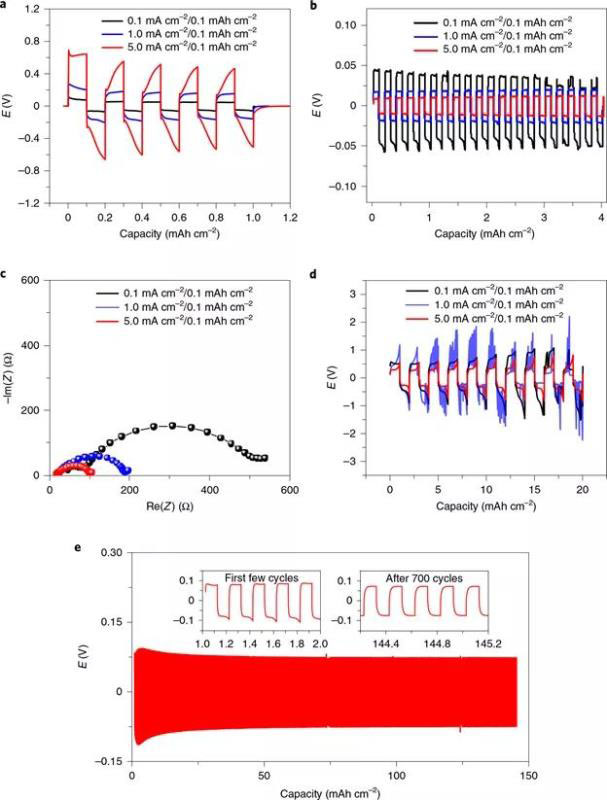 為了驗(yàn)證該假設(shè),作者基于含50 mol%NaFSI鹽的C3mpyrFSI離子液體體系的Na對(duì)稱(chēng)電池,在50℃下進(jìn)行長(zhǎng)電化學(xué)循環(huán)之前,采用了不同的負(fù)極極化作為預(yù)處理。通過(guò)在三個(gè)樣品上施加0.1、1.0和5.0 mA cm?2三種不同的電流密度(每步0.1 mAh cm?2)進(jìn)行5個(gè)短周期(圖4a),實(shí)現(xiàn)了不同的電極極化;電流密度越大,極化電位越高。預(yù)處理后的每個(gè)樣品在電流密度為0.1和1.0 mA cm?2的情況下進(jìn)一步循環(huán)20個(gè)周期,然后在5.0 mA cm?2的情況下各循環(huán)10個(gè)周期。圖4b,d和補(bǔ)充圖6給出了這些長(zhǎng)循環(huán)的計(jì)時(shí)電位曲線(xiàn)。最后證明了在電流密度為5.0 mA cm-2的條件下預(yù)處理的樣品具有超過(guò)700個(gè)循環(huán)的長(zhǎng)循環(huán)穩(wěn)定性(圖4e)。顯然,在5.0 mA cm?2的預(yù)處理?xiàng)l件下,初始極化電位最大,沉積時(shí)間最短(對(duì)于等量電荷);但是,對(duì)于隨后在0.1 mA cm-2和1.0 mA cm-2處的循環(huán),此電池在三個(gè)電池中顯示出最小的過(guò)電勢(shì)。在0.1 mA cm?2處經(jīng)過(guò)20個(gè)循環(huán)后獲得的電化學(xué)阻抗譜證實(shí)了在5.0 mA cm-2的條件下進(jìn)行預(yù)處理的電池形成了一個(gè)較低的Rct表面(圖4c)。在1.0 mA cm-2和5.0 mA cm-2的條件下進(jìn)一步循環(huán)還表明,在高電流密度下的預(yù)處理有利于對(duì)稱(chēng)電池在更高速率下的循環(huán)行為,而另外兩個(gè)在0.1 mA cm?2和1.0 mA cm?2的較低電流下進(jìn)行預(yù)處理的電池,要么由于短路而失效,要么表現(xiàn)出不穩(wěn)定的電壓分布。值得注意的是,我們觀(guān)察到較高的電流密度預(yù)處理步驟可在1.0 mA cm-2 / 0.1 mAh cm-2的條件下實(shí)現(xiàn)非常穩(wěn)定的長(zhǎng)期恒電流循環(huán)(圖4e顯示700多個(gè)循環(huán)而沒(méi)有故障跡象),表明在這些條件下Na SEI的穩(wěn)定性。