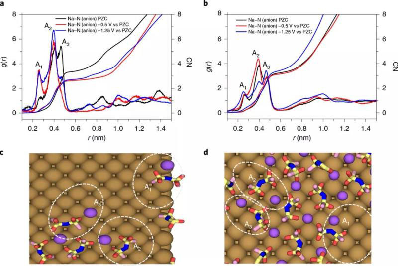 圖3最內(nèi)電解質(zhì)層 Na-FSI配位。在10-mol% (a)和50 mol% (b)鹽體系下,Na-NFSI在電極表面0.61 nm內(nèi)最內(nèi)層配位的RDFs, g(r),以及配位數(shù)分布曲線(xiàn)。兩張快照顯示了在10-mol% (c)和50 mol% (d)鹽體系中,-1.25 V下(相對(duì)于PZC)最內(nèi)層中典型Nax(FSI)y配合物與10-mol%(c)和50-mol% (d)鹽體系中的PZC的對(duì)比。三種類(lèi)型的Na-FSI配位,即A1、A2和A3在圖中有標(biāo)注。