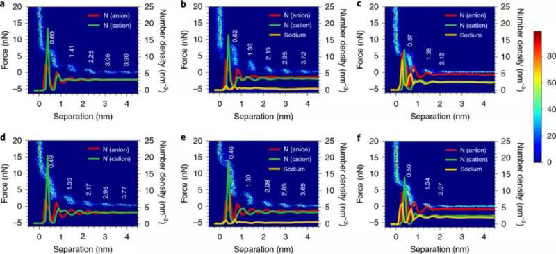 圖1 AFM力測(cè)試與MD模擬獲得的離子液體中界面分層結(jié)構(gòu)。含不同濃度NaFSI(a, d:0mol% , b, e:10mol%, c,f:50mol%)的C3mpyrFSI離子液體在OCP(AFM)和PZC(MD)電位下的AFM力-距離曲線(xiàn)(顏色條在右側(cè))與MD計(jì)算得到的離子數(shù)密度曲線(xiàn)(紅色:[FSI]-,綠色:[C3mpyr]+ ,黃色:Na+ )