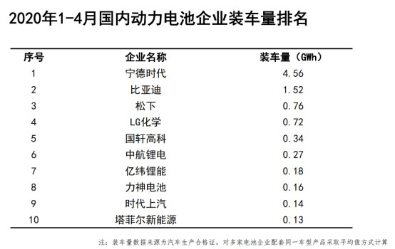 此外,2020年1-4月,我國(guó)動(dòng)力電池裝車量排名前十的企業(yè)分別是寧德時(shí)代、比亞迪、松下、LG化學(xué)、國(guó)軒高科、中航鋰電、億緯鋰能、力神電池、時(shí)代上汽、塔菲爾新能源。