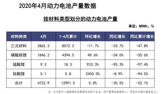 此外,2020年1-4月,我國(guó)三元電池產(chǎn)量累計(jì)為8.6GWh,占總產(chǎn)量66.0%,同比累計(jì)下降47.8%;磷酸鐵鋰電池產(chǎn)量累計(jì)為4.4GWh,占總產(chǎn)量33.8%,同比累計(jì)下降55.6%。