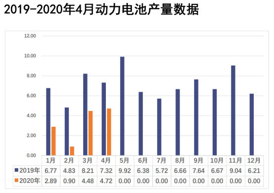 2020年4月,我國(guó)動(dòng)力電池產(chǎn)量共計(jì)4.7GWh,環(huán)比3月的4.5GWh上升了5.5%,同比2019年4月的7.3GW下降了35.5%。此外,2020年1-4月,我國(guó)動(dòng)力電池產(chǎn)量累計(jì)13.0GWh,同比累計(jì)下降52.1%。