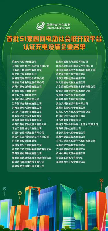 附:首批51家國(guó)網(wǎng)電動(dòng)社會(huì)樁開(kāi)放平臺(tái)認(rèn)證充電設(shè)施企業(yè)名單