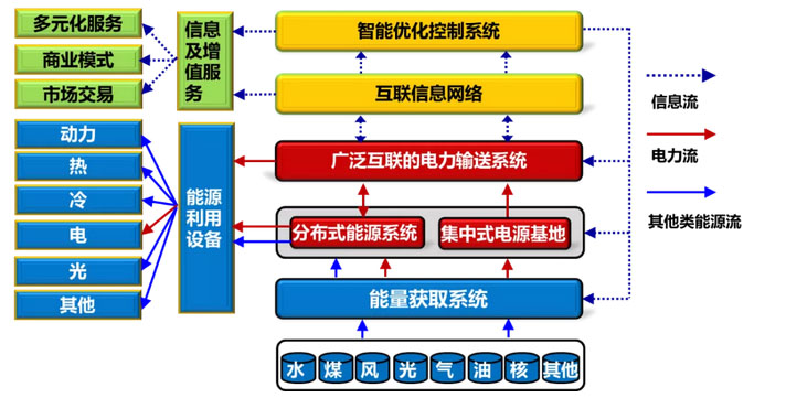 以智能電網(wǎng)為核心、具有廣泛互聯(lián)和智能化特征的能源輸送網(wǎng)絡(luò)將構(gòu)成骨干網(wǎng)架,實(shí)現(xiàn)以電為中心的大范圍余缺互濟(jì)、經(jīng)濟(jì)高效配置和系統(tǒng)級安全保障;以多種能源分散、梯級利用為特征的分布式能源系統(tǒng)將構(gòu)成末端節(jié)點(diǎn),實(shí)現(xiàn)能源的集約高效利用。