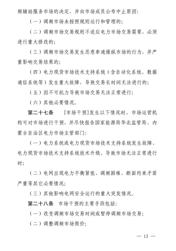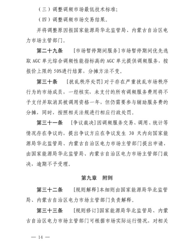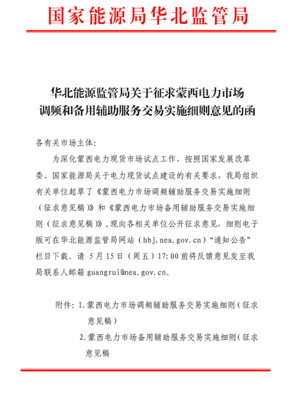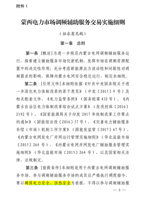 近日,華北能監(jiān)局發(fā)布《蒙西電力市場(chǎng)調(diào)頻和備用輔助服務(wù)交易實(shí)施細(xì)則征求意見(jiàn)稿》。